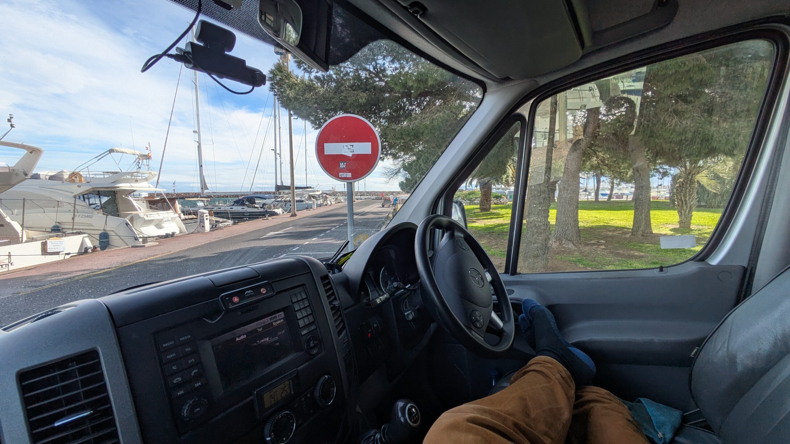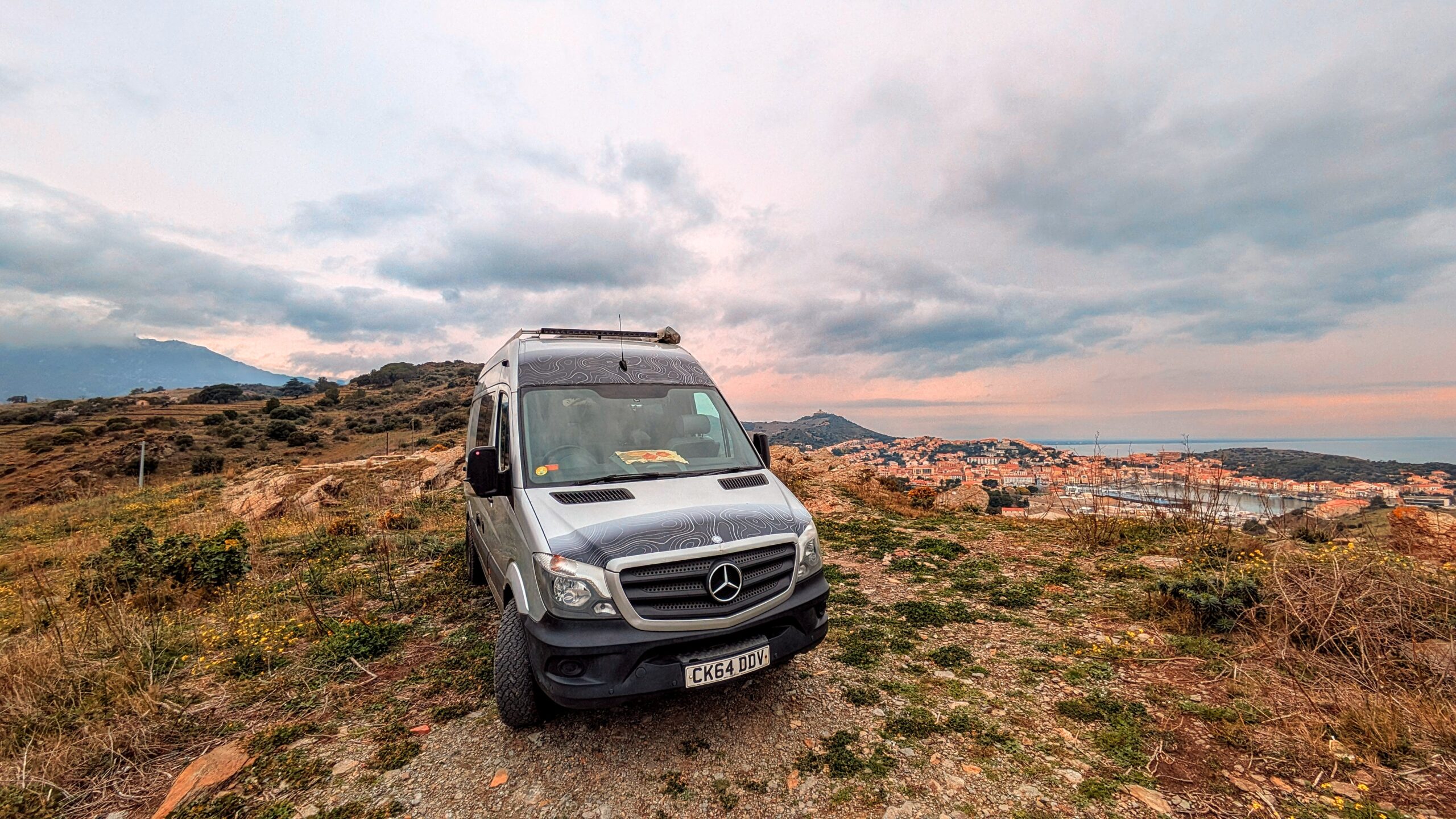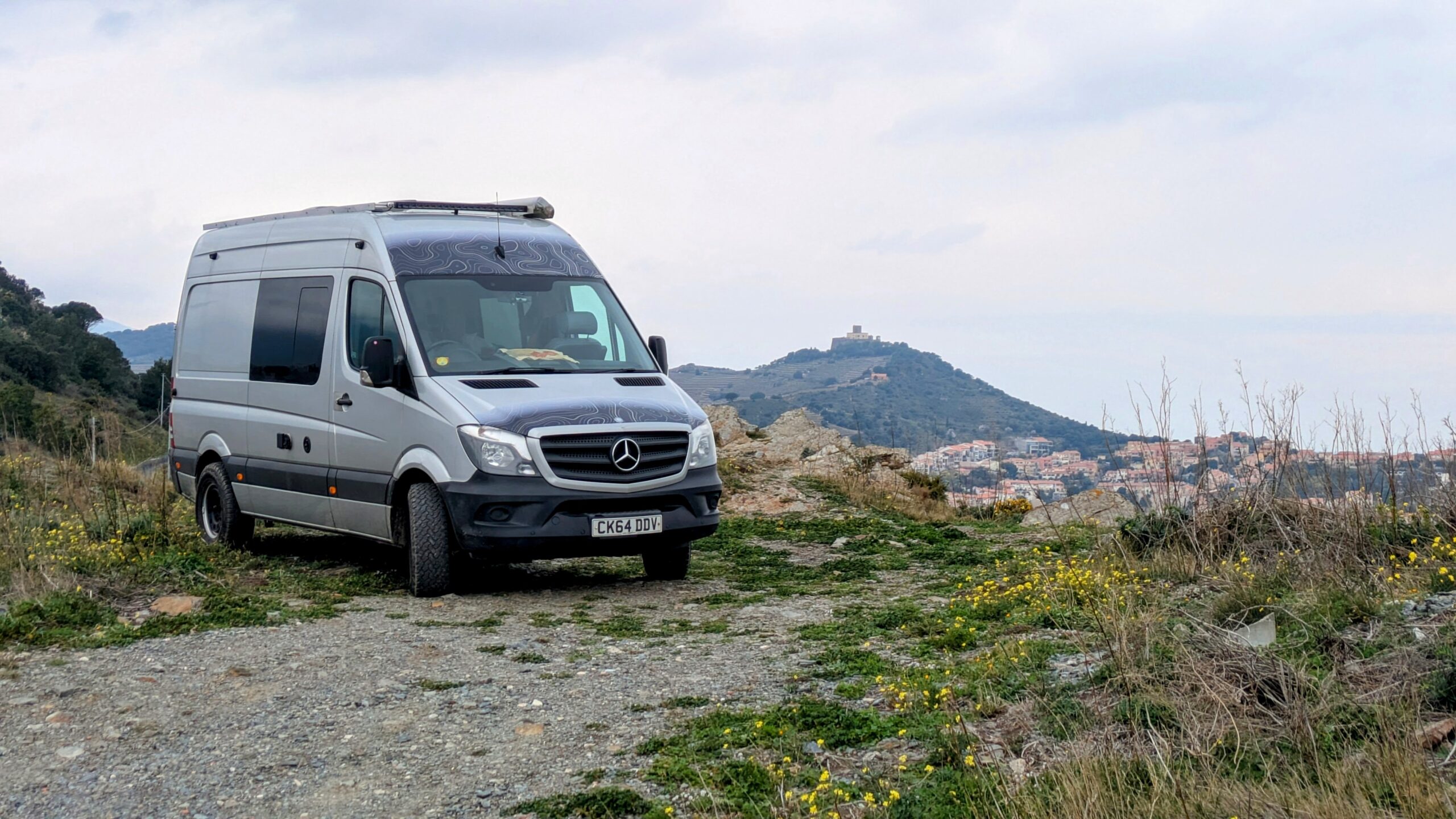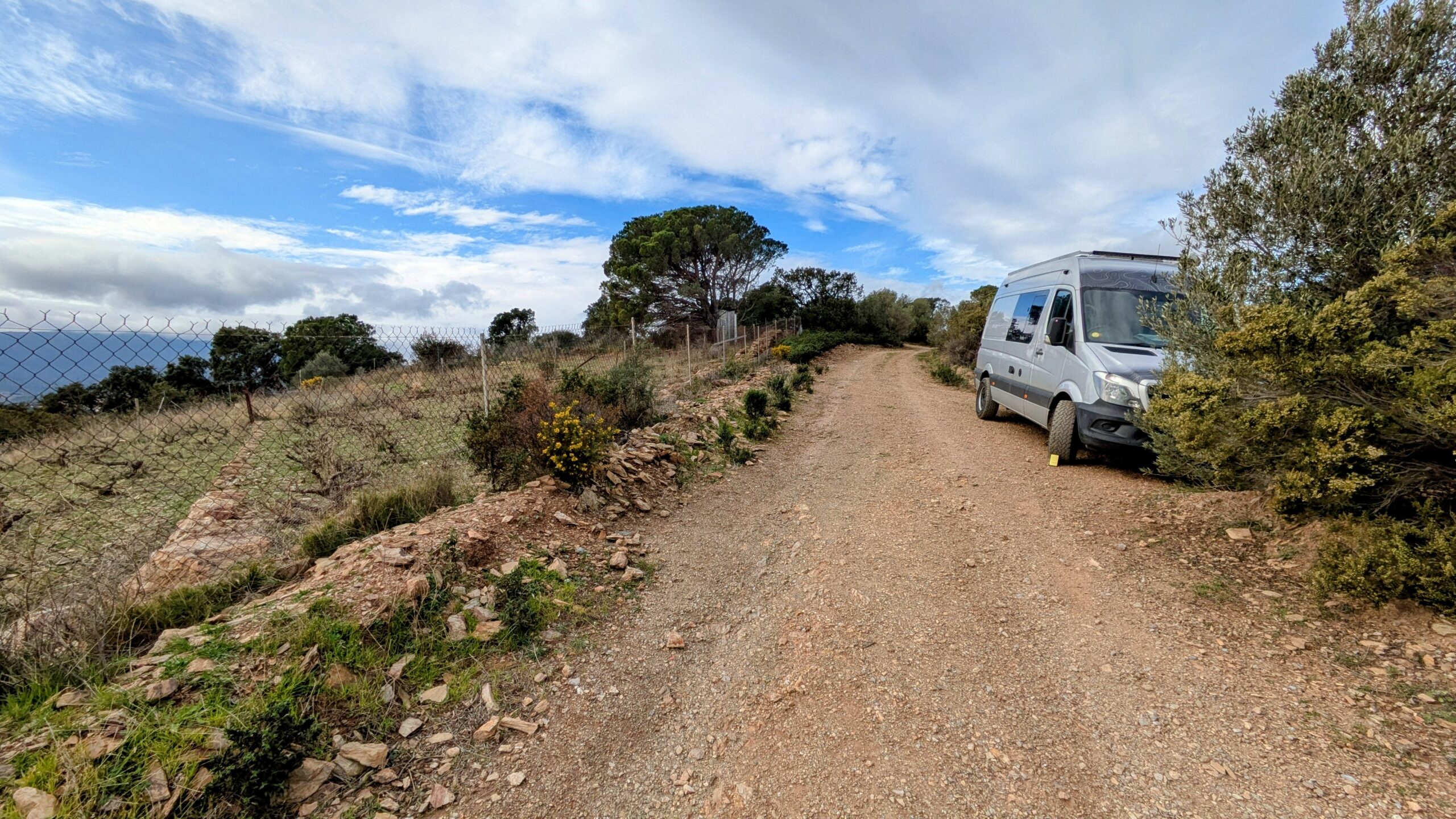 This was the hairiest drive I've attempted in a long while. Spurred on by the fact that someone had said they'd driven this track to an extra special wild camping spot in their First Ducato just last month on Park4Night I lurched straight on up the steep gravel trail into the hills towards the most southerly coastline of France. I made it to the top with some wheel spinning due to the uneven nature of the trailing making my big old heavy Sprinter lurch from side to side. I could see the goal and it looked like a flat park up with spectacular views, but the trail down to it from the top there looked way to hairy. I pulled over and walked it. No chance. I bottled it. Even if I;d slithered down would I ever make it back up? Too much at stake with your home on your back so I managed a 3 point turn and wobbled back down testing my brakes to their limit.