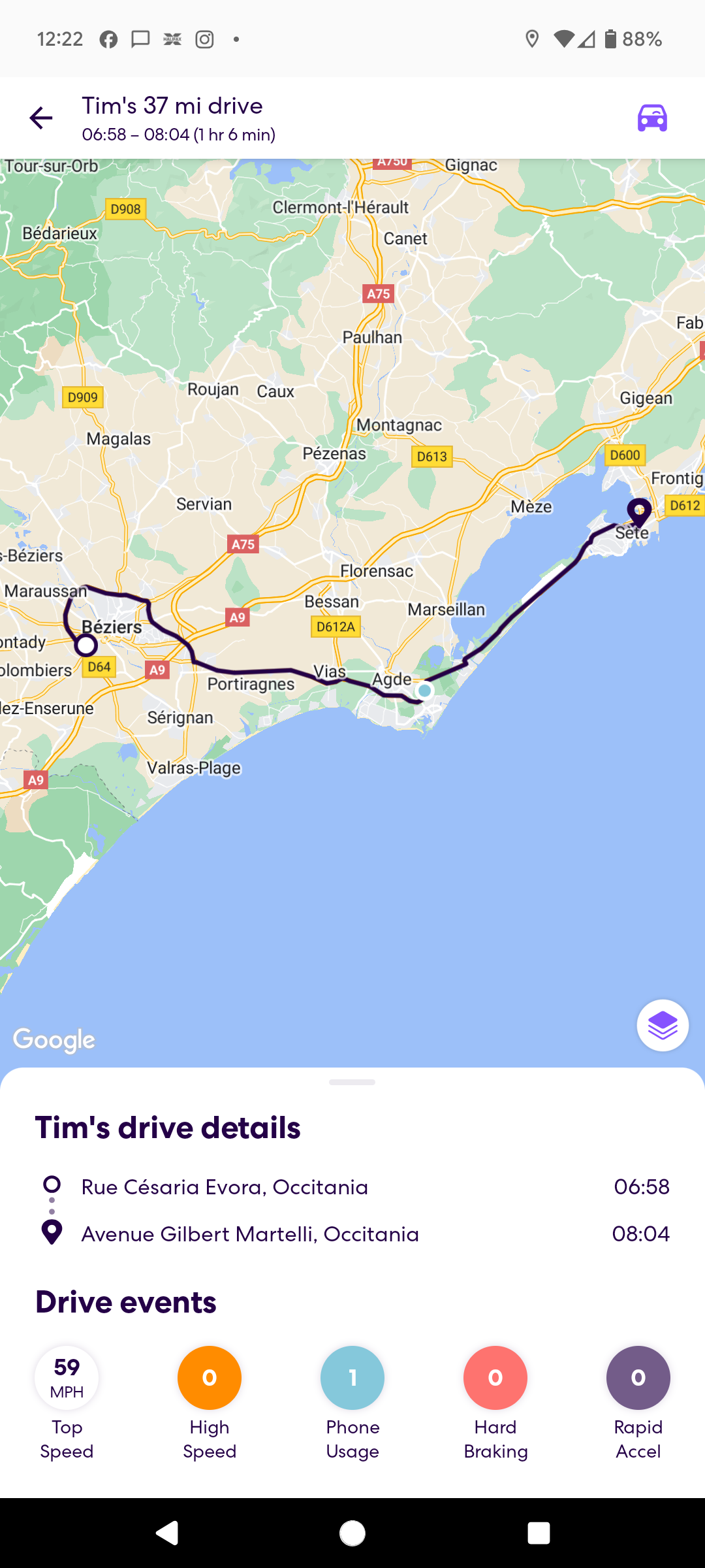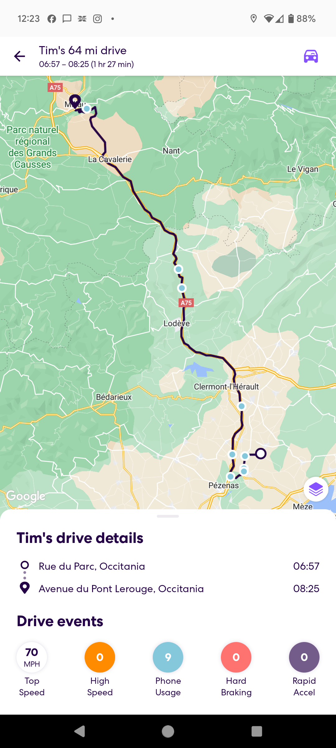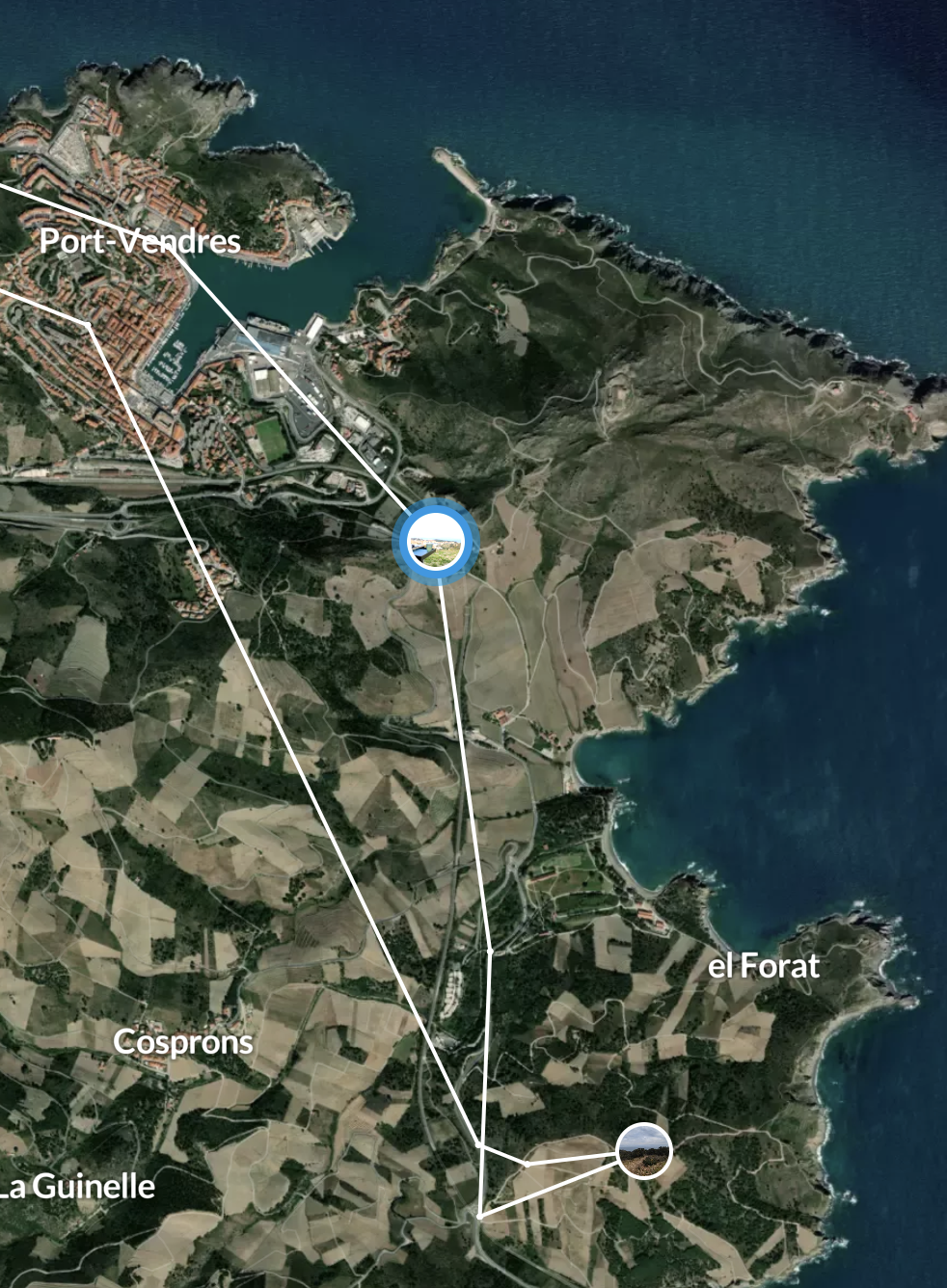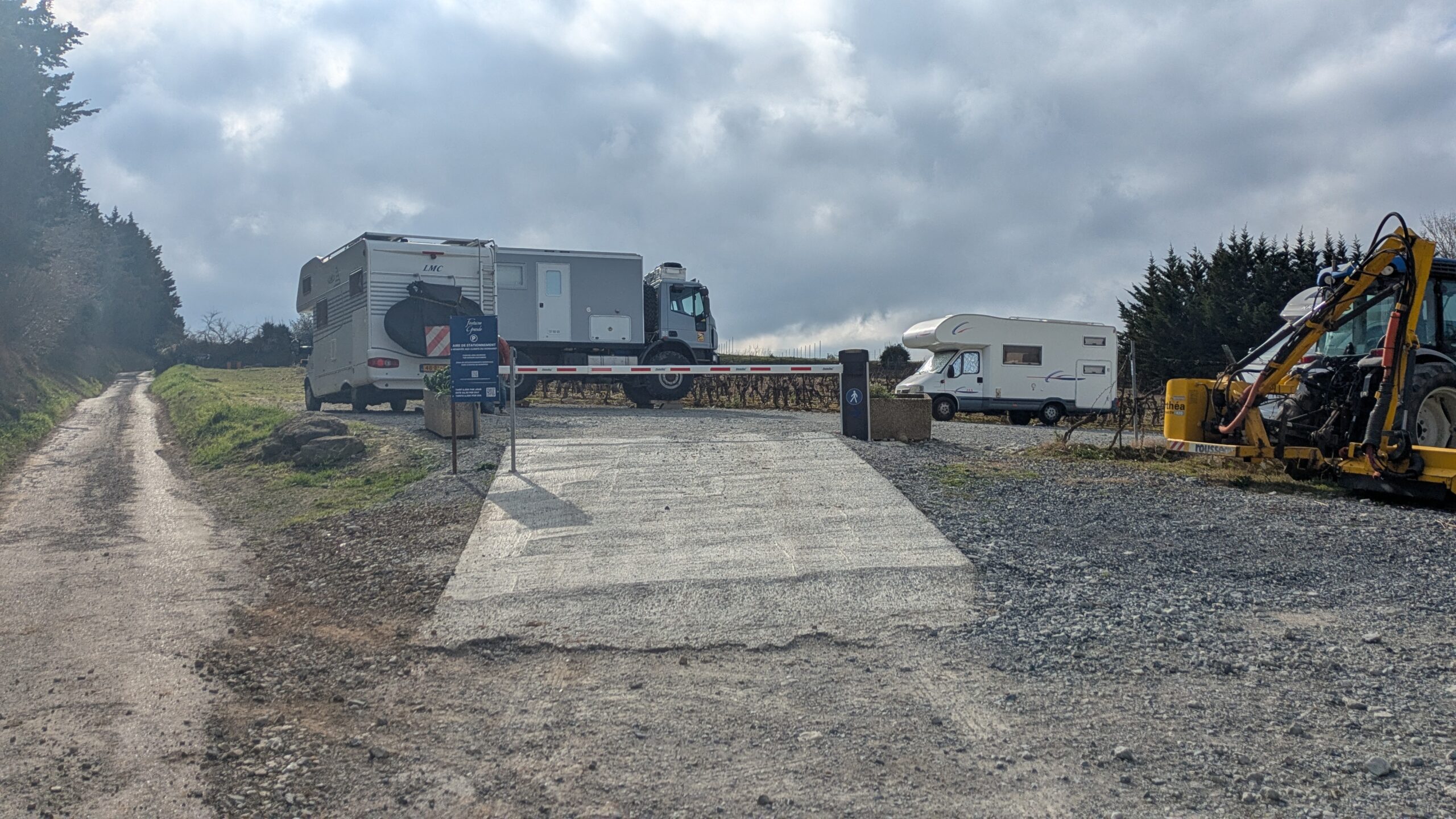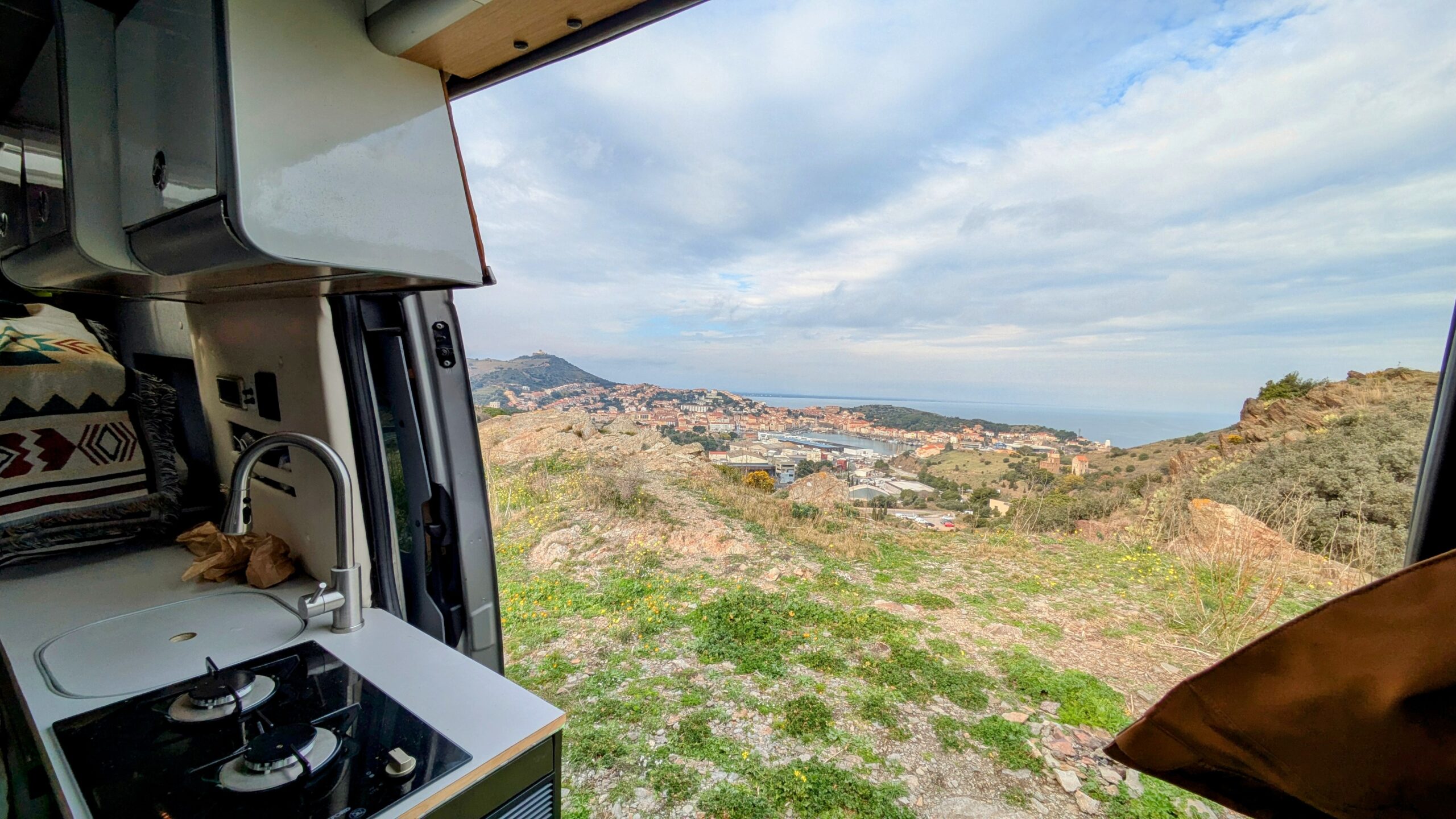 This was the hairiest drive I've attempted in a long while. Spurred on by the fact that someone had said they'd driven this track to an extra special wild camping spot in their First Ducato just last month on Park4Night I lurched straight on up the steep gravel trail into the hills towards the most southerly coastline of France. I made it to the top with some wheel spinning due to the uneven nature of the trailing making my big old heavy Sprinter lurch from side to side. I could see the goal and it looked like a flat park up with spectacular views, but the trail down to it from the top there looked way to hairy. I pulled over and walked it. No chance. I bottled it. Even if I;d slithered down would I ever make it back up? Too much at stake with your home on your back so I managed a 3 point turn and wobbled back down testing my brakes to their limit.