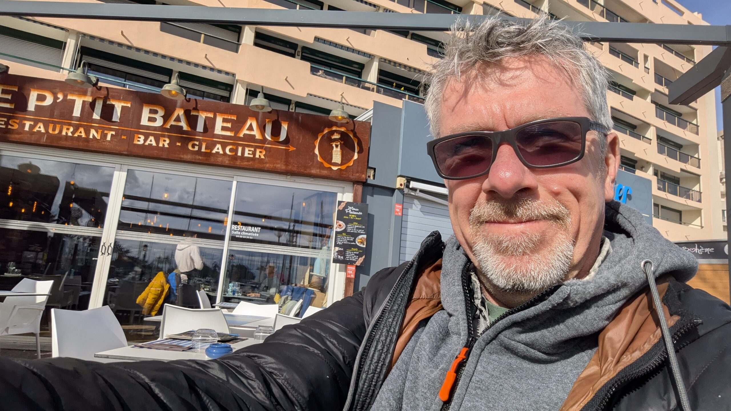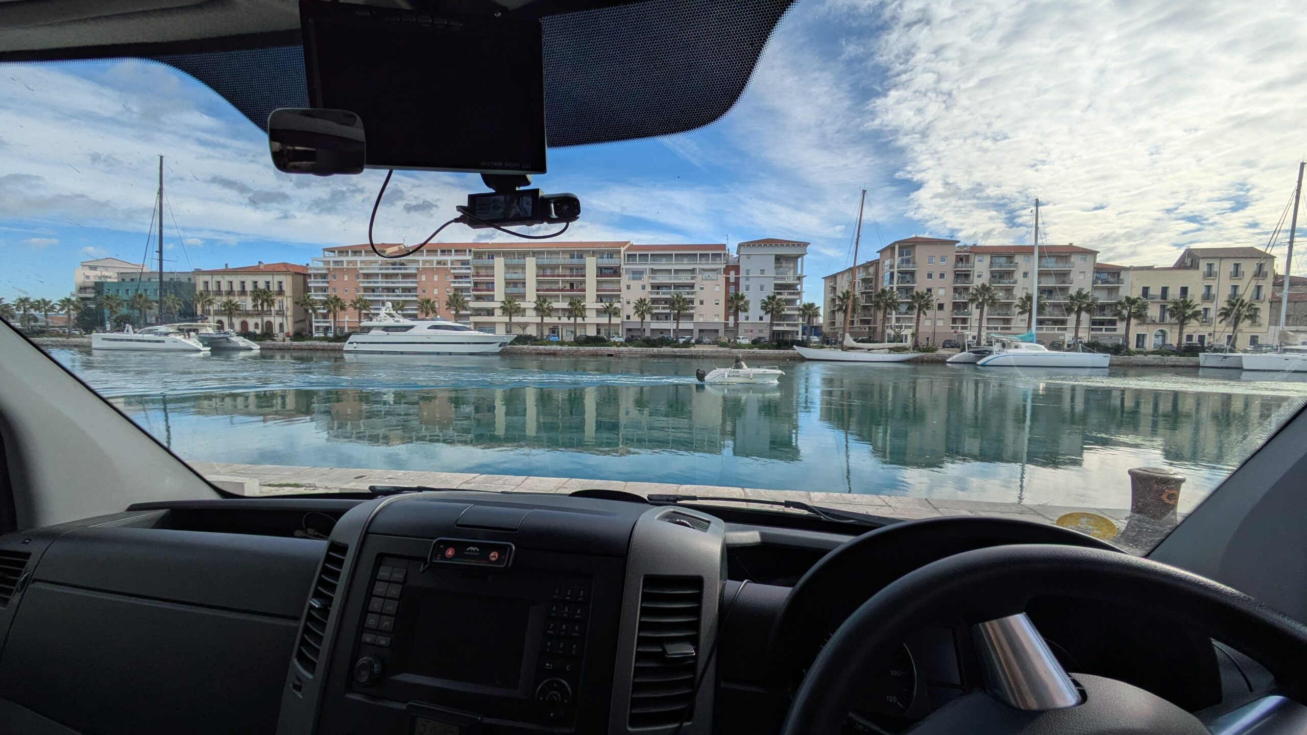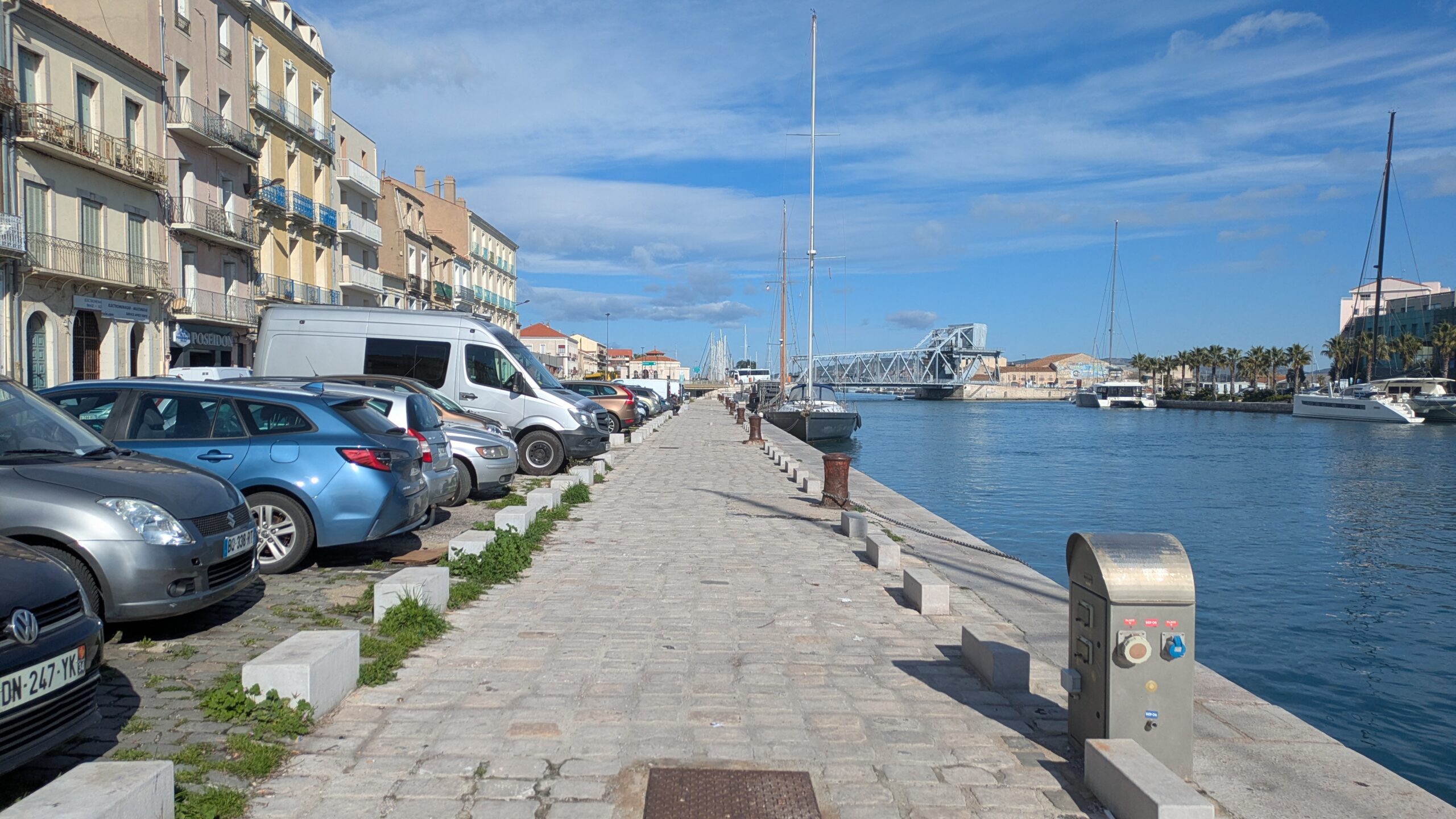 Happy Valentines! It took quite a lot of research to find a park-up in Sête. In the end I settled on the McDonald's car park about 2 mi out of town and walked in. It was lovely to be back here. The sun came out and it was warm enough to sit and have a coffee at the canal side. I strolled through the back streets and into the bursting, deliciously smelling and warm Les Halles, to stock up on provisions for the next few nights. Fillet steak, cod loin and some veg and fruit. Determining that I could park nearer the town centre for work I walked back to McDonald's and drove in to find almost immediately a parking spot that allowed me to face one of the wide and more luxurious canals as my base for the afternoons work.