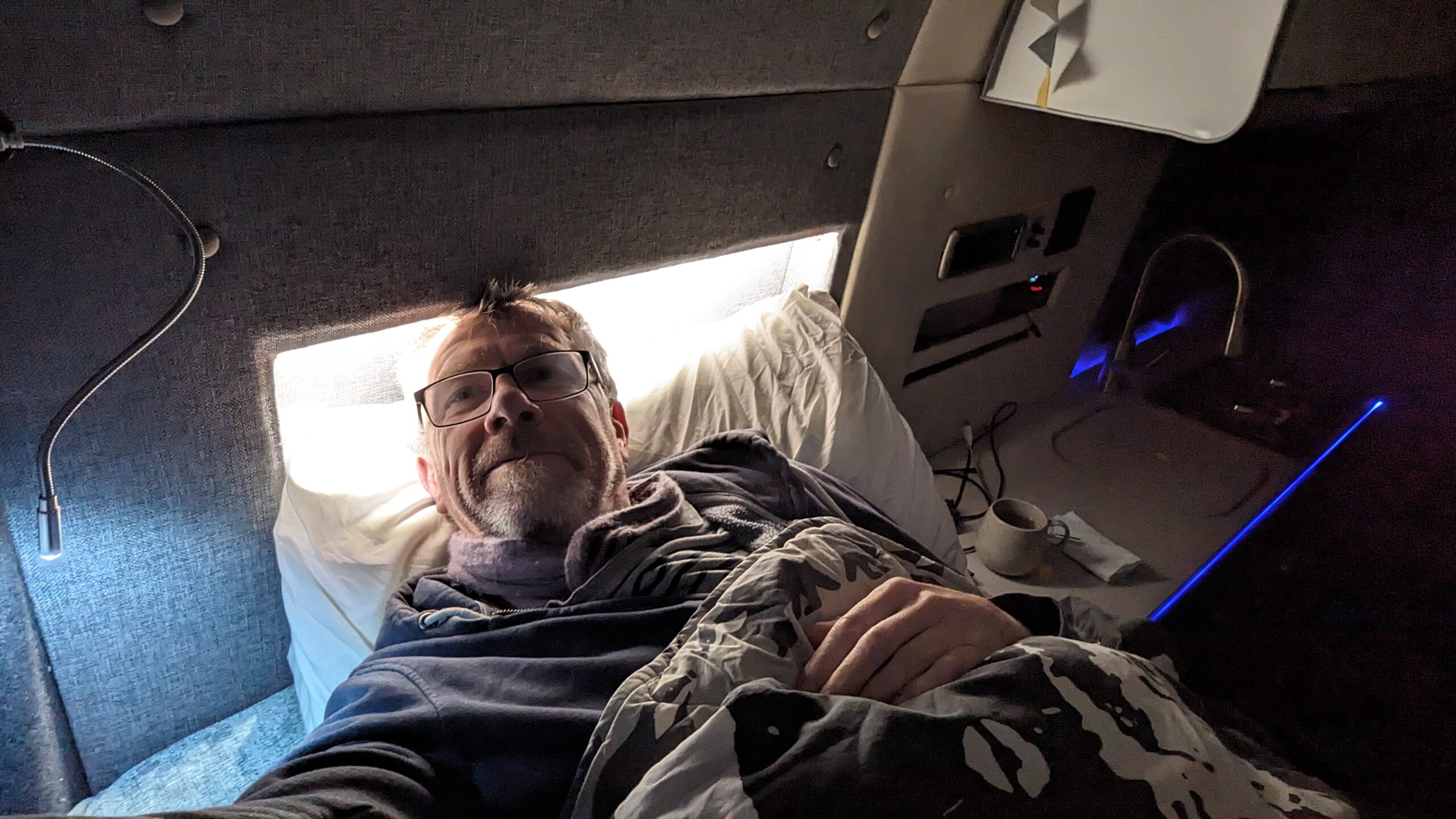 Looking back through the photos, you can see that learning curve: mugs of morning coffee balanced on makeshift tables, bedding that’s clearly “temporary but comfortable enough”, and a jumble of gear that hadn’t yet found its forever home.